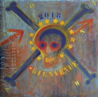 On peut distinguer mes empreintes de pieds ainsi que des empreintes plus petites représentant les personnes de tout âge ayant tenté le périple.La tête de mort, synonyme du danger, représente les risques de ce grand voyage.Autour de la tête de mort sont représentées les étoiles Européennes soulignant l’accueil superficiel proposé aux naufragés.La rose des vents est illustrée avec une accentuation vers le Nord dirigeant vers le « camping calais »