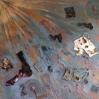 Ce tableau représente un homme, avec ses deux enfants, qui est rentré dans un champ de mines. On voit les traces de leurs pieds dans la boue, ces traces se terminent sur une mine. Les vêtements de marque représentent le monde actuel. C’est une sorte de clin d’œil pour les associations qui se battent contre les mines dans le monde.