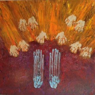 Le tableau représente une personne s’échappant, d’autres voudraient la rattraper : y parviennent-elles ? A vous de l’imaginer… Il y a de plus en plus de gens en difficulté, ouvrons les yeux !