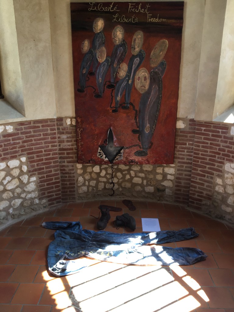 Ce tableau représente la Liberté en Europe. Les prisonniers enchaînés représentent les différents pays n’ayant pas accès à ces libertés. La combinaison hors du tableau suggère un individu, qui a réussi à se libérer de ses chaînes grâce à notre droit de libertés : liberté de presse, de penser, d’expression, de culte, d’opinion, d’association, économique, de conscience, de mouvement…